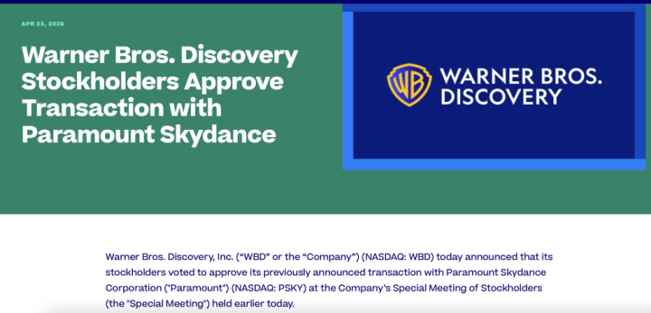 当地时间4月23日,华纳兄弟探索官网发布消息称,当天公司股东投票批准了与派拉蒙天空舞传媒公司(“派拉蒙”)的合并协议。这意味着这笔高达千亿美元的大型并购迈出了关键一步。